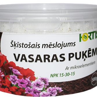 NPK 15-30-15+2 ar mikroelementiem. Ūdenī pilnīgi šķīstošs kompleksais minerālmēslojums, kas nodrošina pilnvērtīgu barības vielu kompleksu augiem viegli uzņemamā formā. HORTIS šķīstošais mēslojums 100% sastāv no augstvērtīgiem barības vielu elementiem, tas nesatur hloru un ir pilnīgi drošs augiem. Tas veicina augu optimālu augšanu un attīstību, sekmē ziedu veidošanos, paildzina ziedēšanas periodu,